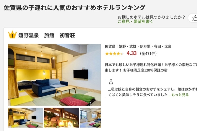 このたび、楽天トラベル掲載の「佐賀県の子連れに人気のおすすめホテルランキング」にて、初音荘が第1位に選ばれました。